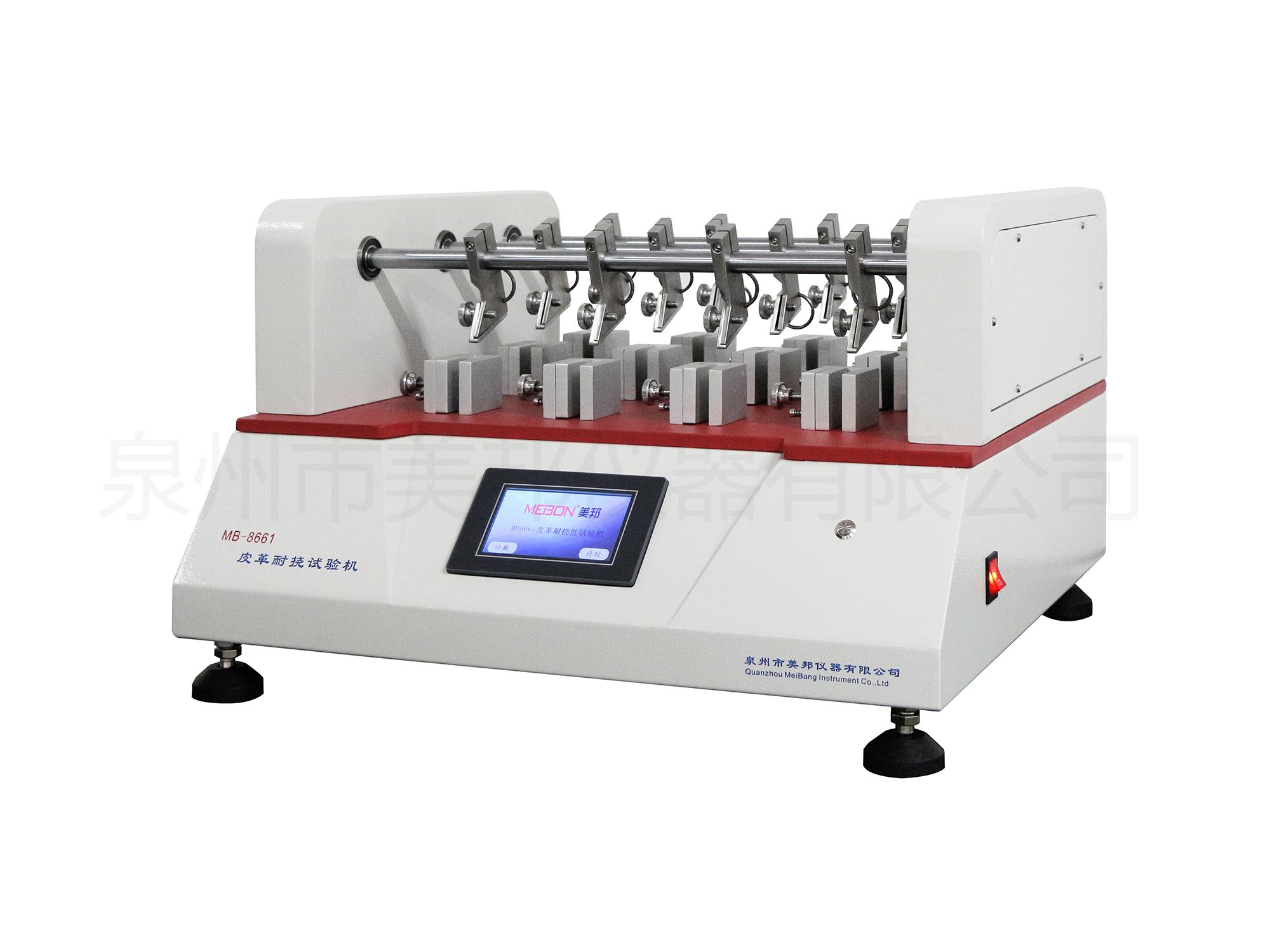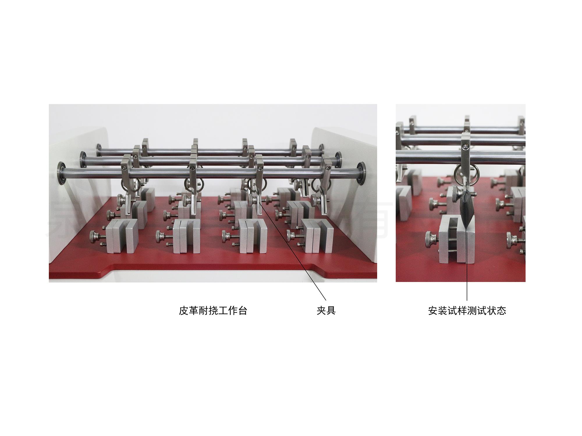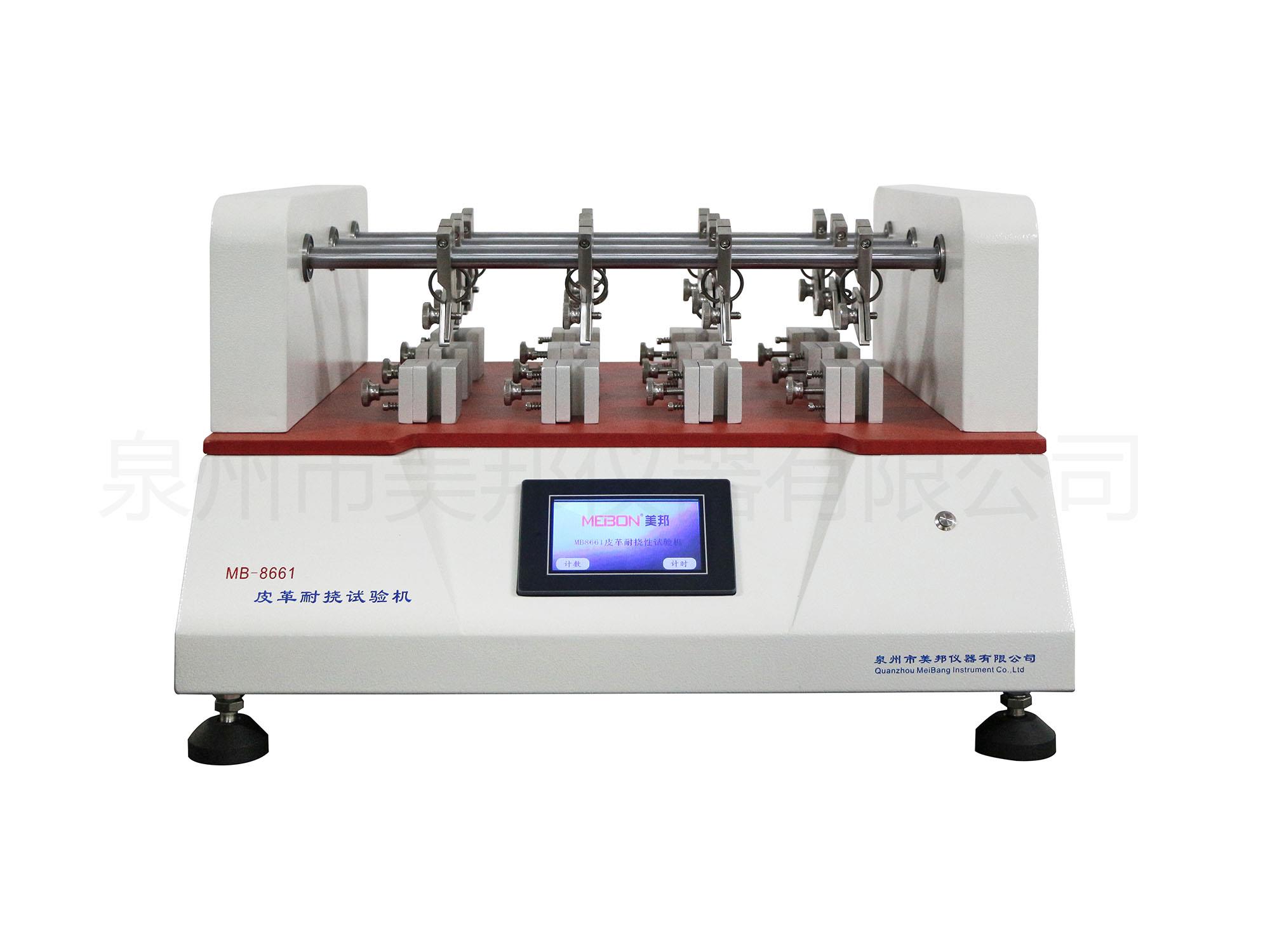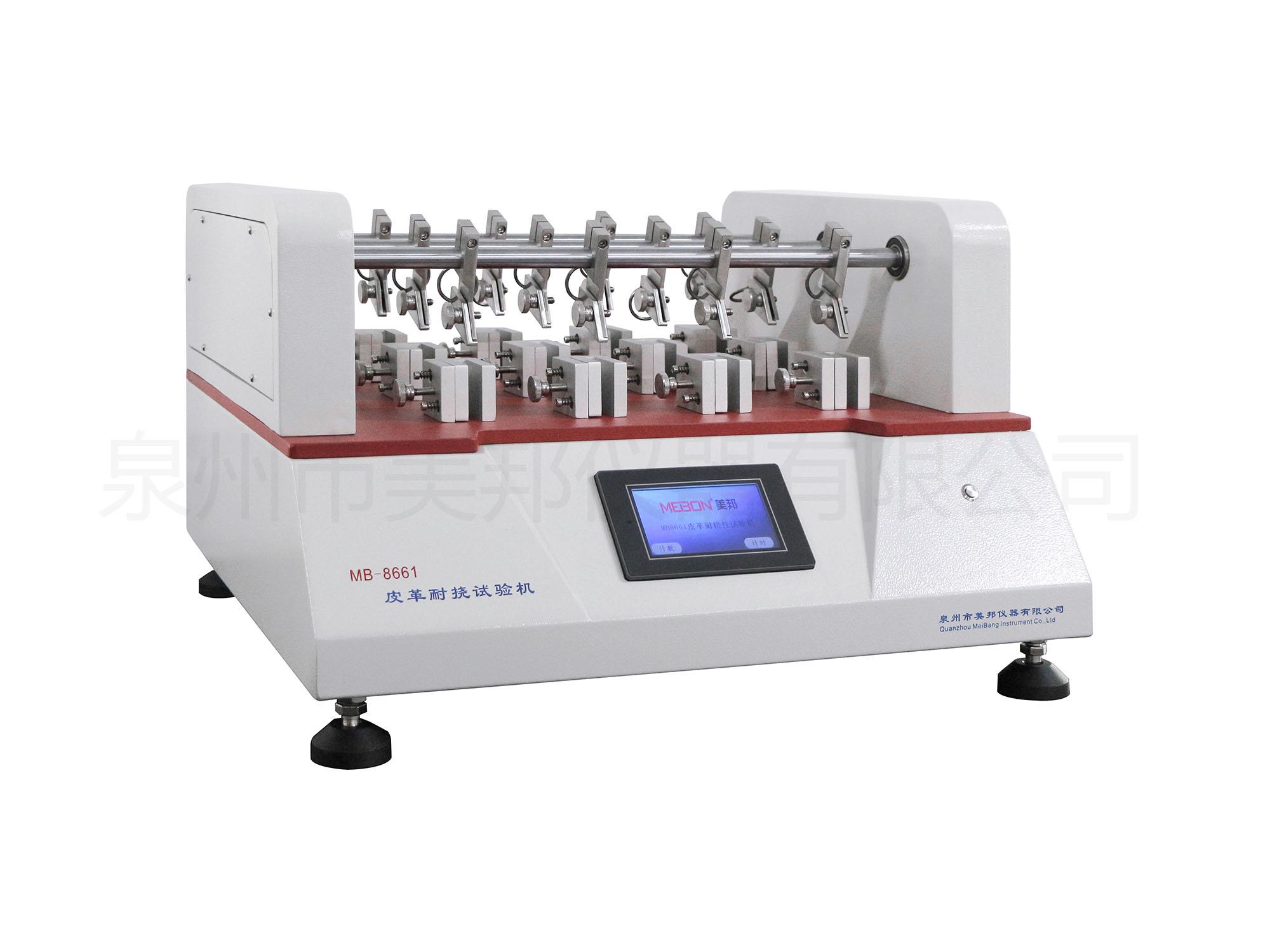 用于測試各種皮革、內(nèi)襯、衣料或袋類用等薄物革,通過被測材料的內(nèi)外側(cè)夾住,反覆曲折一定次數(shù)后,觀察曲折后的損壞程度,來測定其耐撓性。