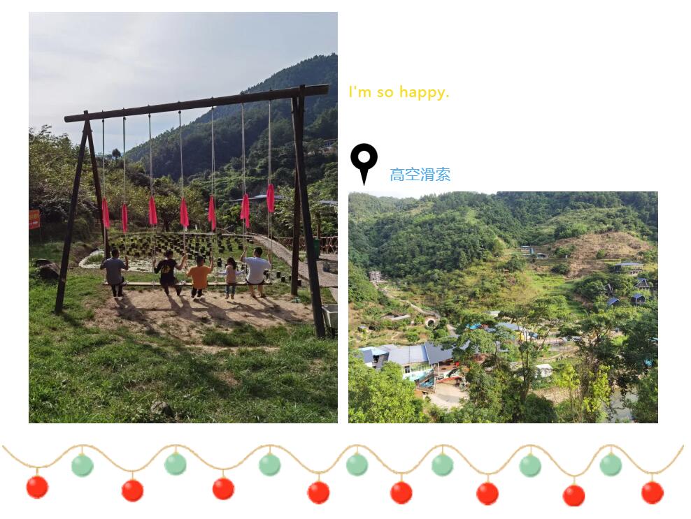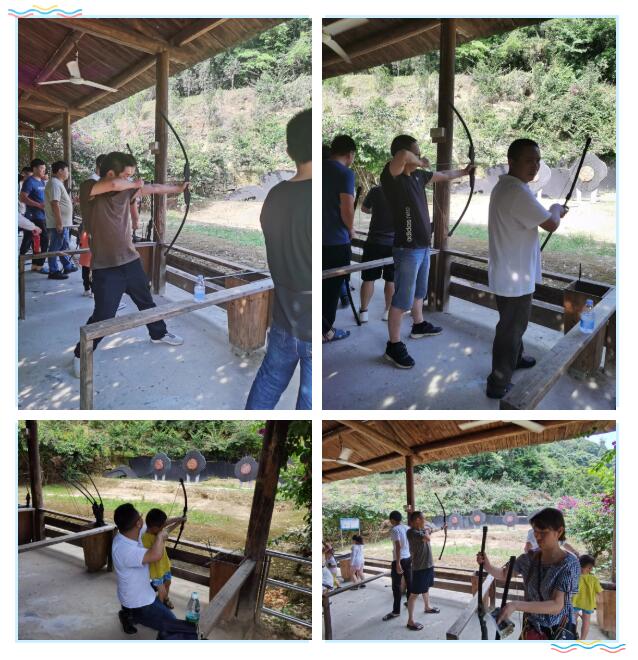 下午全體徒步到射箭區(qū)域、體驗射箭,拉弓、瞄準(zhǔn)靶心、放箭,射箭不僅考驗眼力,也很考驗臂力,體驗完射箭,途徑過蕩秋千區(qū),蹺蹺板,木樁等游樂設(shè)施,大家也玩得很開心,繼續(xù)前行,到達(dá)高空滑索體驗區(qū),每個人興奮不已,體驗速度與激情。
