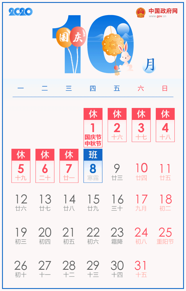 ● 放假時(shí)間:10月1日至7日放假調(diào)休,共7天。10月8日(星期四)上班。