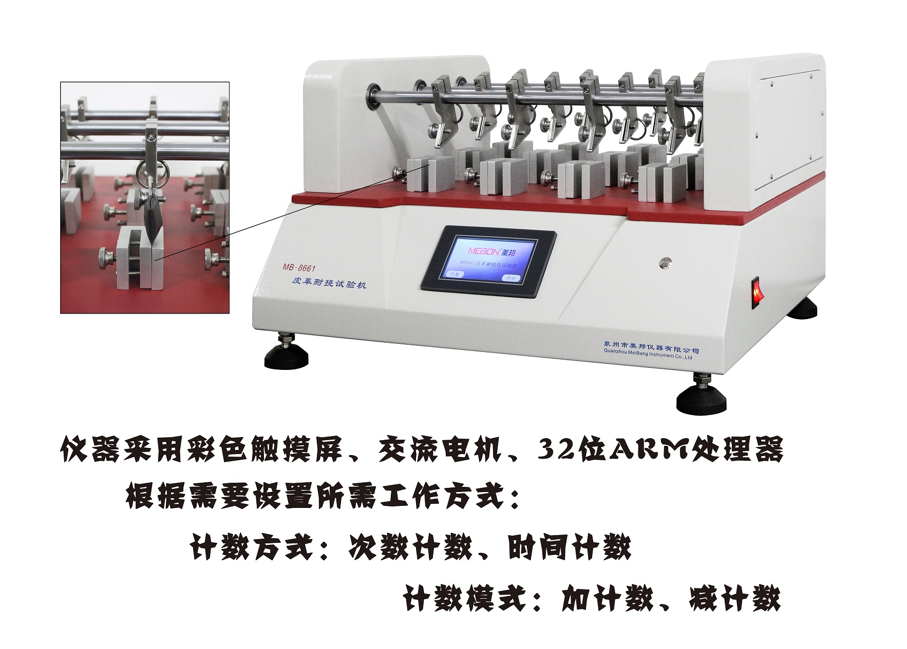 用于以往復(fù)伸縮快動作,模擬鞋子穿著后,行走過程中鞋面受到的拉伸、擠壓、曲折的伸縮,造成鞋子材料產(chǎn)生褶痕,皺紋或受損情形,作為選用鞋面材料參考依據(jù)。