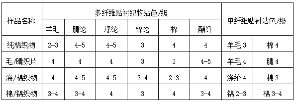 多纖維貼襯系由多種纖維組合而成,因其結(jié)構(gòu)、紗支和密度與單纖維貼襯不同,所以沾色效果不同。以常用的SDC多纖DW為例按GB/T3921A(1)方法不同,比對結(jié)果見表2。